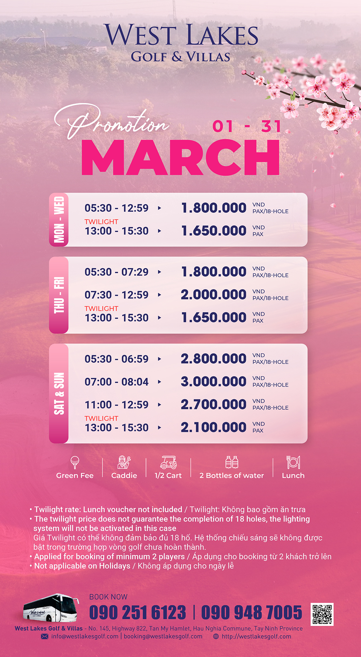 Tháng 3 đến, West Lakes gửi đến golfer loạt ưu đãi green fee hấp dẫn áp dụng từ 01–31/03 cho các khung giờ mỗi ngày trong tuần.